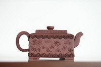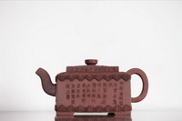 名称:艺术品仿制-清贴花莲塘纹御制诗紫砂方壶(原文物首都博物馆馆藏)编号:20113840115价格:¥4000元规格:高12cm,口径10cm材质:紫砂产地:宜兴说明:该壶采用贴花技法在壶的三面以莲塘纹为装饰,画面深浅有致,莲花朵朵,姿态各异;莲叶片片,互有掩映,颇得池中清趣。另一面为御制诗:“御制再游龙,井即景杂詠,振鹭翻飞百尺流。声空尘耳色空眸,却会识得根源处,乃自龙湫更上头”。