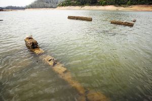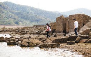 昨天下午,记者沿之前发现的古村落中的小河继续前进,在跋山涉水后发现了更多裸露的古村落遗址。这个村保存相对完整,有一处墙体还能看到门、窗的形状。而不远处,另一个村的遗址半浮出水面,似乎已等不及向世人证实它的存在。