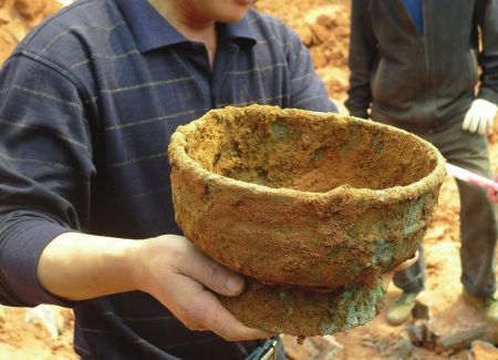 挖掘机一铲挥下,1800多年前的陶罐、陶俑、青铜器、铁器重见天日。8日下午,乐山市区在成都理工大学工程技术学院校园内,发现一座东汉崖墓。连续两日,当地文物部门对古墓进行了抢救性发掘,共出土文物30多件。其中一件青铜豆极具价值,为乐山首次发掘出完整造型的青铜器。