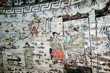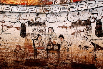 “古人事死如事生,这些画面都是反映当时的生活场景。”现场的一位专家指着画有4个人物的一幅画面说,这应该画的是一个待客的场景,坐着的主人和坐着的客人在谈话,旁边站立着一位侍者。桌子上摆放着茶具和盛有汤勺的盆子等餐具,在人物旁边有两幅画有竹子的画轴。