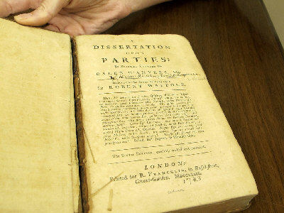 这本1743年的巨著《政党论文》(Dissertation Upon Parties)是勃林布洛克勋爵圣强(Henry St. John Lord Bolingbroke)撰写的,也是殖民者和外交家麦肯吉在18世纪捐给查尔斯顿学院的800本书中的一本。这些书被放在1748年建立的查尔斯顿图书馆协会,等待查尔斯顿学院建立其自己的图书馆。