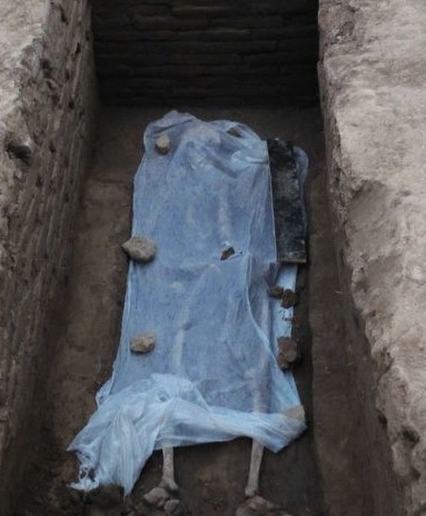 淄博市文物局的刘局长认为,发现涂有朱砂的尸骨的墓坑,年代可能更为久远,是西汉年间的墓坑。“从葬俗等因素判断,这个墓比昨天发掘的墓要更久远。这些骸骨的位置已经打乱,可能是二次下葬。就是人死后被安葬在一个地方后,由于某种原因,尸骨又被取出,迁至此处再次下葬。”刘局长告诉记者,在这个墓坑的东侧,并排挨着两个墓坑,有可能是夫妻墓或家族墓,但具体情况还要等旁边两个墓坑发掘完后才有定论。