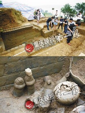 东汉陶棺现身地位于大渡口区跳蹬镇石盘村七组。这是一块长江北岸平缓坡地。“古砖10多年前就零零散散看到过,从来没想过会埋着古墓。”当地村民杨志安说,这原是一片土和水田,近两年才被改成葡萄园。今年3月,葡萄园老板杨志芳挖便道时,挖掘机突然挖出一些砖。今年5月,市文物考古所和大渡口区文管所,在周围发现了3座墓葬,相隔不出百米远,考古人员判断这是东汉到六朝时期的砖室墓葬。