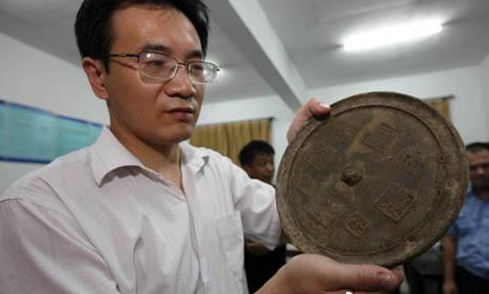 当地文物部门现场勘查后,初步推断该铜镜为明清时期文物,直径约20公分,正面锈迹比较严重,铜镜反面铭文“福禄寿喜”和“五子登科”仍清晰可见,同时现场还出土两只做工不是太精细的双系陶罐。该县文物局工作人员介绍说,从出土的铜镜和陶罐分析,这是当时一般平民的墓葬,铜镜和陶罐是陪葬用品。图为工作人员在查看出土的铜镜。