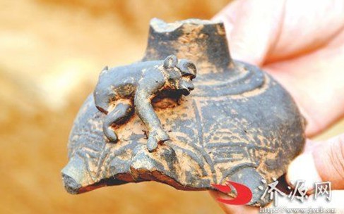 最为珍贵的是龟形座博山炉。尽管炉柄以上部分已残缺,但龟形座博山炉做工极为精致,用泥质灰陶烧制。龟四足朝外正用力爬行,刚探出小脑袋,却被背上的一只瘦猴伸长臂一爪死死按住,两物相嘻的瞬间被定格在工匠的精湛技艺中。龟背模印连续的龟甲纹和连珠纹。中央有一个圆柱状粗柄,擎托顶部的博山炉,定是稳如泰山。单独以龟或猴为造型体裁的文物并不少见,用两种以上动物组合的也比较常见,如马背驻有蜜蜂、猴子喻为“马上封侯”。但是,龟猴组合的器物造型,不仅在济源地区,而且在全国范围内,也属首次发现,有很高的研究价值。