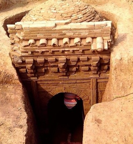 在这些古墓中,有4座北宋晚期的砖石结构古墓保存较好。记者现场看到,这4座古墓的墓室、甬道、门楼、墓道几乎都没有遭到破坏(如图);墓室的直径在3米左右,用青灰色长方砖砌筑而成;墓室内砖雕壁画清晰可见;墓主人陪葬品较少。