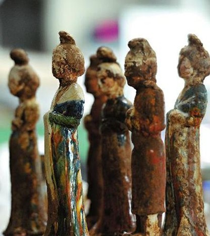 而从侧面看,有些女俑身体呈现出类似“S”的曲线,可以想象当时的女性以其苗条的身材,匀婷的体态、华美的衣着、优雅的举止,呈现出贵妇人的形象,颇具美感。为何没有体现市民常识中“唐代以胖为美”的特色呢?考古专家介绍,唐初女子大多都是比较苗条,直到开元盛世,也就是唐玄宗时期,才开始以胖为美。
