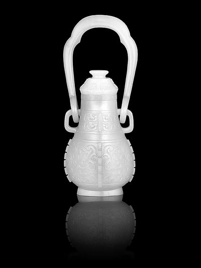 “清乾隆青玉雕仿古兽面纹提梁卣”制作非常精美,卣为古代重要的盛酒器,卣主要流行于商和西周。这件清朝的“提梁卣”为青玉雕成。