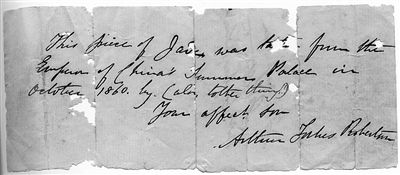 罗伯森写给他母亲的纸条上写着:“这块玉和其他东西都是1860年10月从中国夏宫带出来的。”