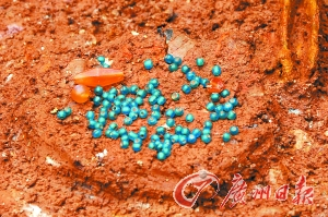 在这堆陶器旁边,较集中的散落着几十颗绿豆大小的湖蓝色珠子,几颗黄褐色玛瑙样的宝石。尽管经年累月,仍然色泽鲜艳,光亮如新,十分引人注目。估计是墓室主人用来陪葬的珠宝首饰。