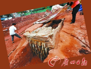 发现古墓的地方位于淘金路太和岗路口淘金家园楼盘前的一处在建工地,周围均是商住小区楼盘。记者在现场看到,路边的一块红土地上被挖出了几个长方形的格子,工人们拿着锄头、铲子、毛刷等工具小心翼翼地挖掘着两座砖结构的墓藏。几位专家在现场指挥并拍摄影像信息。附近的住户告诉记者,挖掘工作已进行了一个多月。