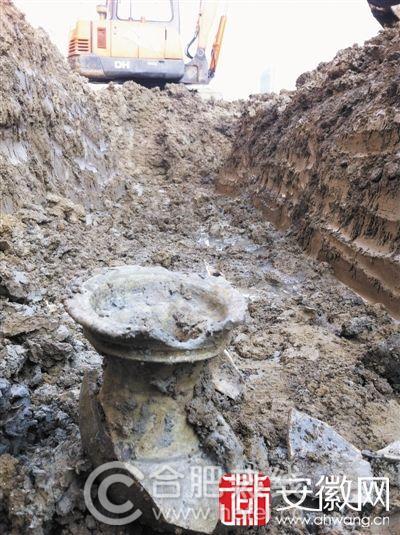 此处为凤阳东路拓宽工程,铺设路面前,需要掘土埋放热力管道。沟壑离地面约一米多深,几件破裂的古物静静地“躺在”起伏不平的泥层中。