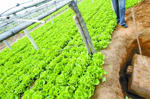 两通圣旨碑四周是大片的拱棚菜园,种植的生菜等生长旺盛。“这两通碑,就是在菜园里被发现的。”弓寨村多位村民称,它们埋藏在菜园最浅处,目测约有50厘米深。菜园经过几十年的耕种,居然没被发现。