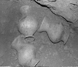 通过现场勘查,工作人员对此处墓葬进行了抢救性清理发掘。该处墓葬为砖室券顶墓,坐北朝南,墓室长4.6m,宽1.6m,通高1.76m,呈拱形;墓门宽0.8m,高1.4m,呈拱形;墓室底部为“人”字形铺砖。经清理发掘,出土陶器5件,其中陶钟3件,灰陶残片1包,陶钵1件;出土铜钱15枚,其中,带“泉”字1枚,带“五”字1枚。
