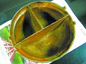 刘非很会吃火锅,在分格鼎旁边还出土了两套“染器”。所谓染器,就是吃火锅时放佐料的盘子。从这些来年的考古发现来看,染器有的是盘状,有的则呈杯状,如果有加热装置,则称为“染炉”。