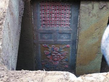 昨日,在宜宾市翠屏区江北公园改造施工现场,在公园内原游乐场的位置挖掘出一座明清时期的古墓。华西城市读本记者赶到现场,从挖开的古墓口中能够清晰地看见深坑里面雕饰精美的石门,内面石砌的门窗清晰可见,牡丹、水壶等各式雕花艳丽夺目,保存完好。目前,宜宾市文物专家正对其进行考证。