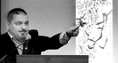 图为拍卖师正在拍卖《紫藤蜜蜂图》