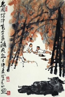 如果说李可染早期的牧牛图作品中袒露给观众的是个性情中人,是一个诙谐幽默、保有童心的艺术家,那么在李可染主攻山水画之后,我们看到他重在追求崇高严肃的东西,他性格中的天真需要有一个适当的渠道来表达发泄,牧童和牛就成了很好的对象和载体。雄伟的山水是他对精神的不断升华,牧童与牛使他的灵魂不断净化。在“峰高无坦途”的山水画革新路上,不时有“牧童遥指杏花村”,不仅是很好的劳逸搭配,也恰好反映出李可染生命情调的两个侧面。