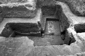 该墓葬群位于城北北辰大道西侧附近,西距汉长安城约7000米。今年5月,市文物保护考古研究院清理出了8座古墓。由于破坏严重,出土器物只有120件,包括砚、盆、甑、耳杯、狗、鸡等陶器以及博局镜、铜釜、小铜环等铜器。从墓葬形制、出土器物组合及器型特征分析,8座墓的年代可分为两个时期。M1号—M7号墓是斜坡墓道单室和多室墓,墓葬形制与器物组合均与西安地区东汉中、晚期特征相同。因此推断这7座墓的年代为东汉中期至东汉晚期。M8号墓的墓室略呈横长方形,出土器物中小泥饼及陶罐残片,推测为北朝时期。而这次发掘的7座东汉墓方向一致,排列有序,东西三排,西侧两座。墓室有单室、双室、三室和四室,结构有土洞、砖室和土洞砖室混合结构。西安市文物保护考古研究院研究员张翔宇说,根据详细情况推断,这应该是一处经过严格规划的家族墓地,从出土器物和古墓规格上来看,应该是平民墓。