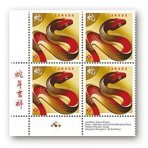 加拿大邮政总局从1997年开始,每年按中国农历生肖推出一套纪念邮票。农历癸巳蛇年邮票是加拿大邮政总局发行的第二轮生肖邮票中的第5套。这套蛇年邮票分国内邮资版和国际邮资版两款。国内邮资版的图案是一条金色鳞纹的赤蛇在水波中婀娜滑行,表现了蛇灵动、敏锐的特性。国际邮资版的图案则是一条绿色玉蛇盘绕成“8”字,象征着吉祥幸运。