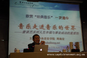 12月27日,在这个跨年之际,首都博物馆特邀中央音乐学院副院长兼音乐学系教授周海宏,与我馆员工一起体验了一场关于音乐、关于艺术、关于人生的探索。在两个小时的分享中,周海宏教授进行了题为《走进音乐的世界-兼谈艺术在人类生活中的意义》的讲座,并用各种音乐旋律打开我们的听觉神经,带领我们走进高雅音乐的殿堂,并引导我们用心体会音乐与心灵之间产生的强大共鸣。从大众音乐普及,到音乐心理学、音乐美学的探讨,对大众艺术修养都是一次不可多得的提升。