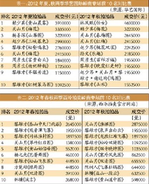 从华艺国际两季拍卖的成交前10名看,拍品基本上是关山月、黎雄才的作品,成交价主要集中在100万~400万元之间。相比此前岭南近现代名家作品在2010年~2011年不断创出500万元~1000万元的高价,2012年的表现相对平淡无奇。而西泠拍卖自开始关注岭南名家,成交前10名中至少有一半是黎雄才的作品,最高价为200多万元,稍低于岭南本地。