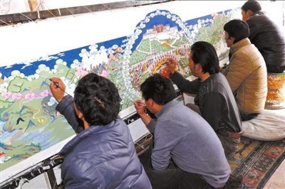 昨天,西藏“百幅唐卡工程”领导小组的成员们评审了艺术专家委员会初评通过的作品,首批45幅作品出炉。这是去年11月日喀则唐卡画师石达(左一)和平措扎西(中)率弟子在创作唐卡作品《吉祥哈达(青川藏公路通车)》。据了解,西藏“百幅唐卡工程”内容包括西藏和平解放60年、西藏文明发展史、西藏风景名胜3个部分,计划用3到5年时间完成。