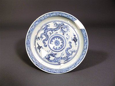 明景泰、天顺青花双龙纹盏托,景德镇戴家弄窑址采集