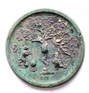 同时出土的铜镜虽然绿锈斑斑,但是正面的图面清晰可见。该铜镜呈现为圆形,桥形钮,直径9.3厘米。正面有桂花树、嫦娥、玉兔和金蟾蜍,铜镜图案生动清晰。