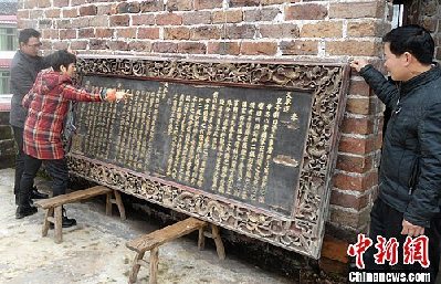 中新社安仁2月19日电 (何书典 肖拾全)湖南省安仁县文物所19日透露,在该县豪山乡廖湾村村民何春辉家中,发现一块刻有清朝同治皇帝爱新觉罗·载淳两道手书圣旨的木匾额,“这在当地尚属首次发现,非常罕见”。
