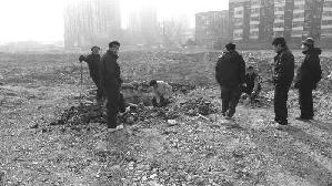 近日,北京永定门外革新里拆迁工地引来盗墓人,展开了一场盗墓大战。2月26日,记者在现场看到,操着河南口音的几拨人正在用金属探杆、铁锨、镐头不断发掘着,看到有人过来,还向来人推销手里的“战利品”。不远处,专业的考古人员也在工地上积极地找寻。