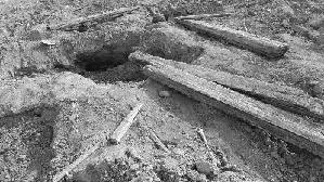 盗墓现场,有些棺木、骸骨散落一地。