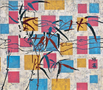 第三、西方大师,主要是蒙德里安和阿尔伯斯的线条和色块的各种重构,附在主画面之上,鲜活跳跃,给抽象赋予一种具象的实际意义,产生出一种非常有趣味的形式和内容、西方和东方的对话。
