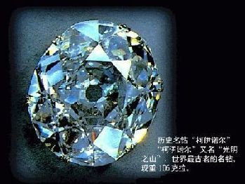 “科依诺尔”在波斯语中意为“光明之山”,重约105克拉,曾为世界最大钻石,现安置于伦敦塔中供参观。