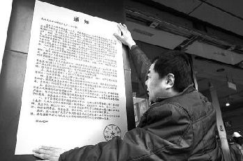 3月20日上午,工作人员正在民族大世界商场门口张贴腾退安置通知。