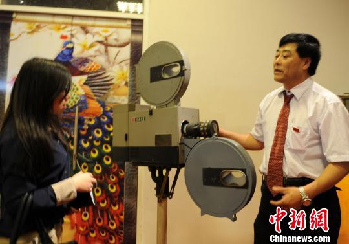 肇庆市涞馨艺术馆吴馨光馆长(右)在介绍馆藏的老式电影机。