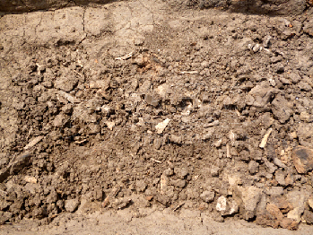 在遗址北侧位置的两三个柱坑内,记者找到网友“后海崖”所提到的细碎骨骸。虽然裸露在外,但这些长度约在几厘米的骨骸,已经与干结的泥土混杂在一起,不仔细看,很难辨认。