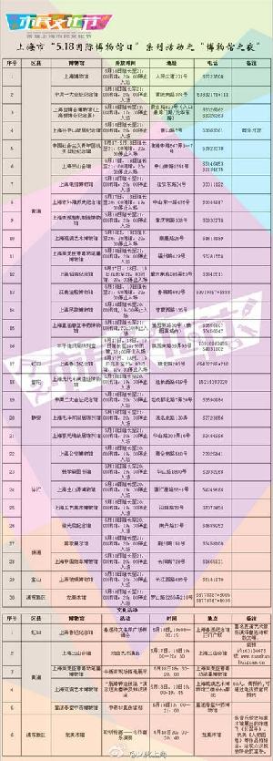 每年的5月18日,是一年一度的国际博物馆日。据上海市文化广播影视管理局官方微博消息,5月17日至19日,全市30家重点博物馆将延长开放时间,观众可以在美妙的氛围中欣赏博物馆藏品,领略夜间博物馆的魅力。具体博物馆名单可见附图。