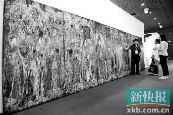 “2013年第三届广州艺术品交易博览会”于5月10日-13日举行,世界最大的漆壁画《永乐大典——朝元仙仗图》(长14.40米,高2.02米)将在白云国际会议中心首次公开展出。该巨作采用中国传统漆艺工艺创作,既有唐代绘画雍容博大的气概,又有宋代清新秀丽的风格。作者、著名漆画家张晓江介绍,画里面有大小人物近300个,最高的有近2米高,绘制耗时足足3年。