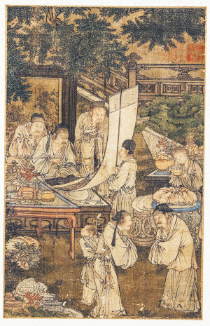 第二件展品是南宋绘画《宋人消夏图》,取材唐中宗时复国有功而封郡王的张柬之、敬晖等五人消夏雅集:画面中人或凝神谛观,或相与评赏,书僮在旁侍应张罗,画家将衣纹、叶片绘得精准圆劲,树叶之石青点染,鲜丽夺目。