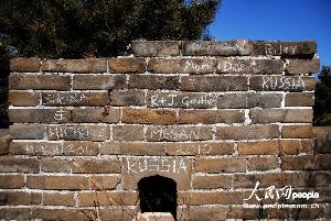 2011年3月27日,初春的北京温暖舒适,户外爱好者攀登慕田峪附近的亓连关长城。长城城砖上写着许多到此一游的名字。
