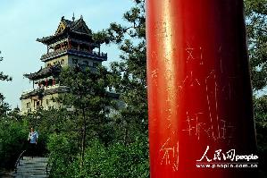 2013年5月23日,在山西阳曲县城南河公园拍摄到的一组“中国式旅游留言”。据了解,这些刻在景区建筑上的字画,大部分是出自一些青少年之手,他们的这些不文明行为,令人气愤。游客呼吁,社会、家庭和学校要加强青少年的德育教育。