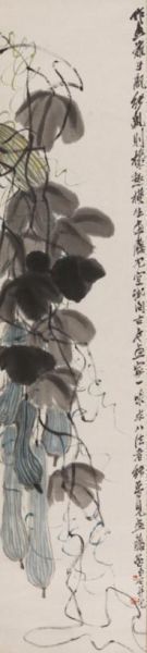 此幅《瓜藤》以纵向构图间,尽显恬淡的生活意趣。瓜叶水润韵秀,藤蔓姿态蜿蜒劲巧,可见老人常于丝瓜藤边细心观察,其形态自然便了然于胸;弧曲之势的瓜型勾画生动有致,粗中见细,形神俱足;浓淡的墨韵相互交叠,淋漓尽致地烘托出瓜的神韵和形质。整个画面藤蔓缠绕,枝叶高低错落,似微风吹拂,不蔓不枝,乱中不乱、乱而有序;一根根形态各异的丝瓜或在叶子缝隙间若隐若现,或在阳光下盘旋扩张,或在缠绕的枝蔓间沉默无语,静中有动、栩栩如生,趣韵无穷,具有极强的空间感与层次感。