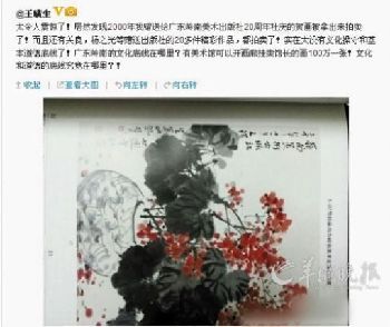 王璜生微博原文如下:“太令人震惊了!居然发现2000年我赠送给广东岭南美术出版社20周年社庆的贺画被拿出来拍卖了!而且还有关良、杨之光等赠送出版社的20多件精彩作品,都拍卖了!实在太没有文化操守和基本道德底线了!广东岭南的文化底线在哪里?有美术馆可以开画廊挂卖馆长的画100万一张!文化和道德的底线究竟在哪里?! ” 微博贴出了被拍卖的画作,题款清楚表明,这件作品是该出版社20周年社庆时,王璜生画赠的。画作上方还标明:1-27号拍品均为广东岭南美术出版社旧藏,表明此次一共有27件藏品参与拍卖。