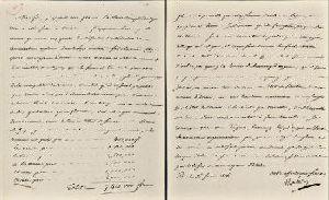 法兰西第一帝国皇帝拿破仑•波拿巴1806年给其子尤金王子亲笔信写于1806年2月16日,全信为法文,共两页。拿破仑于1805年5月26日加冕为意大利国王,因而此封信中他交代尤金王子把部分税收用于支付意大利驻军费用,第一页详细列出了每个区域需要支付的数额,并表达了希望扩军和组织舰队的想法。第二页左下角有拿破仑的亲笔全名签名,极为罕见,保存完好。