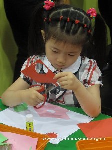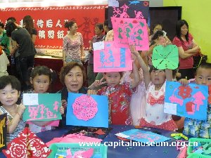6月1日上午,由首都博物馆和宋庆龄基金会共同主办的“大手牵小手——非遗传后人”儿童脱稿剪纸展示活动在首都博物馆七彩坊开幕。这次展览展出的近二百幅作品,全部出自3—6岁儿童之手,而且全部是脱稿剪成。在开幕仪式上,来自新中街幼儿园、乐政务幼儿园的孩子们为观众现场表演了脱稿剪纸,一张红纸,一把剪刀,孩子们现场构思,就剪出了精彩的作品,有反映幼儿园日常生活的《值日生》,有反映亲子游戏的《放风筝》,还有展现自然、动物的剪纸题材等。