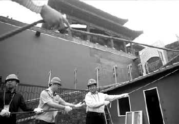 单霁翔与工作人员一起,拆除午门西马道西侧的彩钢房。