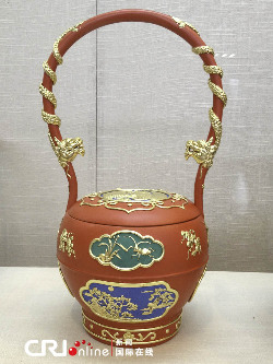 双龙长梁提桶 现代 黄才良作 宁波泥金彩漆