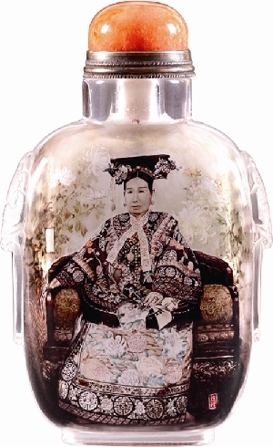 作品材质为天然水晶,此图为光绪二十九年七月始建的《宫中档案薄—圣容账》中有记载,摄于慈溪七旬大寿前后,地点为垂帘听政处—养心殿暖阁。此作品精致入微,中国传统衣饰图案繁缛复杂,但是作者所画处处精到,表现维妙维肖,很多细节要用放大镜才能清楚观赏,此作品展示了大师高超的技艺与对内绘画所能驾驭的程度。