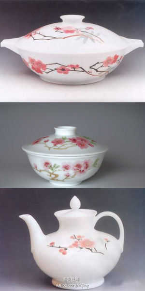 “釉下五彩毛瓷碗”一共有五只,碗上的图案印上春夏秋冬的花卉,据称是配合毛泽东的诗词而创作。